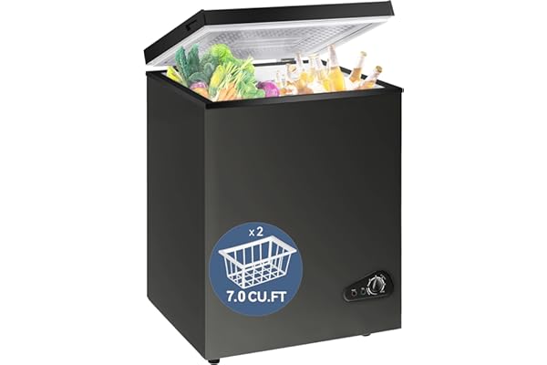 Energy Efficient Design – This 7.0 Cu Ft chest freezer features advanced energy-saving technology, helping you reduce electricity bills while keeping your food fresh. Whether freezing meats, vegetables, or ice cream, enjoy long-lasting freezing performance.It’s about $0.0492 per day (based on a 12-cent per kWh electricity rate).Quiet Operation – Designed with quiet technology, this freezer operates almost silently, making it perfect for use in homes, apartments, or garages. Enjoy a cool environment without the noise disruption.Adjustable Temperature Control – Equipped with a 6-setting adjustable thermostat, you can easily set the temperature according to your needs, ensuring that different foods are stored at their optimal conditions to meet your personalized requirements.User-Friendly Design – The built-in removable basket allows for easy storage and retrieval of food items, helping you keep your frozen goods organized and accessible. The exterior defrost water drain simplifies cleaning and maintenance.Compact and Versatile – This compact deep freezer is designed to fit in various spaces. Whether in your home, office, or garage, it serves as your ideal freezing solution, providing ample storage space to meet all your freezing needs.