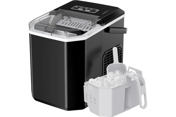 FAST ICE PRODUCTION: Create bullet ice cubes in just 6 minutes! This compressor can generate up to 26 pounds of ice daily, with a storage capacity of 1.3 poundsIDEAL COMPACT DESIGN: With dimensions of only 8.7 x 11.4 x 11.6 inches, this countertop ice maker fits perfectly on your countertop, kitchen island, or desk without occupying too much spaceUSER-FRIENDLY CONTROL PANEL: Enjoy freshly made ice in just three simple steps! Fill the water reservoir, turn the unit on, and choose between small or large ice cubes. The ice machine features an indicator light to alert you when it’s time to refill the water or when the ice basket is fullPORTABLE ICE MAKER: The durable handle makes it easy to transport this ice maker machine, and the included scoop conveniently attaches to the basket for storage. Weighing only 13.7 pounds, you can effortlessly move this compact ice machine from room to room or take it to eventsAUTOMATIC SELF-CLEANING FEATURE: Ensure your ice remains fresh and clean with the automatic self-cleaning function. Simply remove the basket, add water, and hold the CLEAN button for 5 seconds to start the process. After 30 minutes, you’ll be ready to produce a new batch of ice