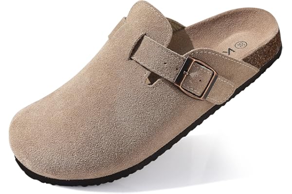 CLASSIC CORK CLOGS: 100% genuine suede look with adjustable metal buckle straps. They are super flattering with spring/summer outfits. Perfect all seasons wardrobe staple. You will get so many compliments when you wear themAMAZING COMFORTABLE: Cork footbed with deep heel cup, soft lining hugs your feet perfectly. They have decent arch support, good cushioning and light weight. Women’s clogs don’t bind your foot in any way and comfy to wear all dayWONDERFUL QUALITY: The buttons is sturdy and upper construction is strong won’t break or fall off. Nice grip on the non-slip outsole bottom, suitable for any surface. Normal use of them will last for a long timeVERSATILE PURPOSE: Slip right in, wear them everywhere, house or grocery store, gym, walking, picking up packages, everywhere! Suitable for both indoor and outdoor usage. Not to mention for casual settings or partyEASY TO CLEAN: Wipe with water. Placed in a ventilated location. Tips: If you have any questions about the size, please contact us at any time