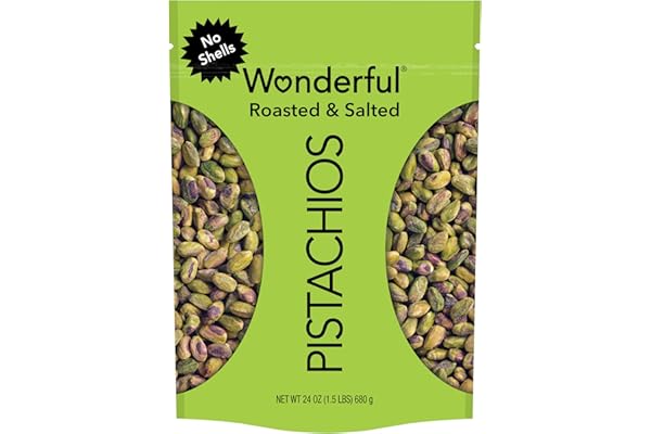 SIZE: Net Wt 24 Ounce (623 g) No Shells – Don’t hold back on Wonderful Pistachios; Our Wonderful Pistachios are the perfect snack to have around the house and for on-the-go; These healthy snacks are the perfect, convenient pantry staple; See nutrition information for fat contentFLAVOR: Roasted & Salted – While these shelled pistachios have the same delicious taste, they are much less work for you. Additionally, with no shell, these pistachios are perfect for cooking, great for snacking, and a tasty, crunchy salad topperCALIFORNIA GROWN: Wonderful Pistachios grows all of its pistachios in California orchards, where we carefully tend and harvest them using the latest in sustainable practices.HEALTHY SNACKING: Pistachios are a healthy, protein-powered addition to any gathering – from party to picnic. Pistachios are a healthy choice for snacking on-the-go and around the house. They make for a wonderful travel snack or office snack.SIMPLY WONDERFUL PISTACHIOS: Gluten Free, Plant Based Protein, Vegetarian, Vegan, Kosher Certified, Halal Certified, and Non-GMO Project Verified. Contains tree nuts (pistachios). Contains only pistachios and sea salt.