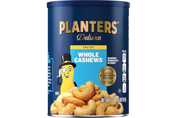 Snacking Made Whole: Go nuts for deluxe whole cashews that satisfy your snack cravings. These creamy whole cashews are nutritious and delicious snack foods the whole family will loveClassic Crunch: Roasted to perfection in peanut oil and seasoned with sea salt, these deluxe cashews have the crunchy texture and natural nutty flavor you expect from PLANTERS snack foodsSnack Strong: PLANTERS Deluxe Salted Cashews contain 5g of plant-based protein and 170 calories per 1oz serving to help ward off hunger and keep you going between mealtimesAlways Satisfying: For parties, cocktail hour, or midday breaks, deluxe salted cashews are always a satisfying snack idea. The resealable airtight cannister is handy for on-the-go snacking on road trips or in officesWhat You Get: Includes one, 2.25oz airtight, resealable canister containing PLANTERS Deluxe Salted Whole Cashews for easy, sharable snacking; Packaged for freshness and great taste