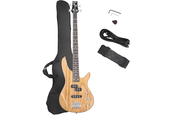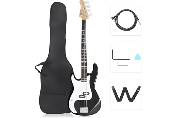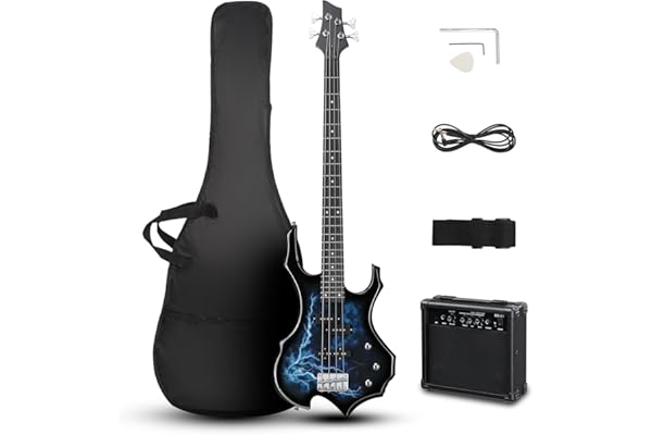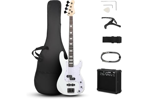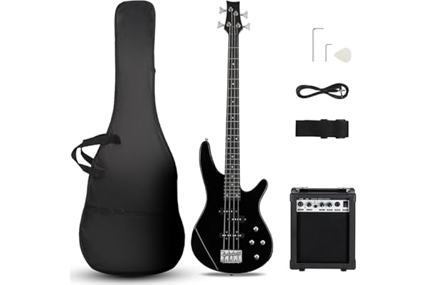 STABLE QUALITY & GREAT FEELINGS: The 4 string bass guitar is made of high-quality basswood on body and stable rosewood on bridge and fingerboard. The ergonomic cut surface of the full size bass guitar and 20-fert provides a fantastic fret-hand feel when you play.EXCELLENT TONE DISPLAY: You can play all the warm and rock music styles you want with the split single-coil pickup and 2 volume knobs. Your tune can be stability and smooth with the thicker strings and larger string tension delivered20W GUITAR AMPLIFIER : Input: (1/4″ Jack) Headphone output: (1/4″ Jack). With 5 front panel controls: Volume, Treble, Mid, Bass, Phones, you can tune your music to any style between blues and metal as you like.BEST GIFT FOR BEGINNER: Theourbass guitar kit is a ideal gift for beginners and suits aspiring musicians too. Each 4 strings and string height can be adjusted and you can fine tuning the neck on the top of the fingerboard.PERFECT ACCESSORIES: Come with 1x Electric Bass Guitar, 1x 20W Amp, 1x Amp Cord, 1x Portable Guitar Bag, 1x Shoulder Strap, 1x Bass Pick. You can playourbass immediately after opening a package.