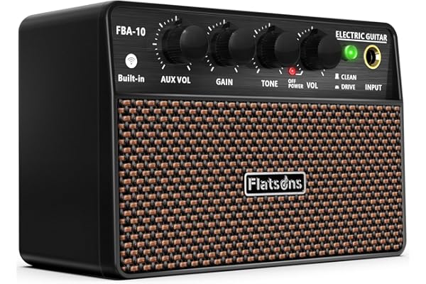Pure Analog Technology for Crystal-Clear Sound: Featuring full analog technology with a precise frequency response of 100Hz-20kHz @ ±3dB, delivering exceptional clarity and natural tone. With 10W high power output, it covers over 165ft, making it perfect for home practice, travel playing, street improvisationDual Tone Modes, Explore Multiple Styles: Featuring two independent tone modes (CLEAN/DRIVE), allowing you to effortlessly switch between a pristine, clear sound and a powerful, driven tone with a single button press. Additionally, the GAIN and TONE controls provide precise adjustments, allowing you to shape guitar sound to perfectionHeadphone/AUX Jack for Greater Flexibility: Enjoy seamless versatility with a 3.5mm headphone jack for quiet practice and an AUX input for external audio sources, giving you the freedom to play, practice, or listen in any setting. Plus, the AUX VOL knob offers precise control over external audio volumeWireless Audio and Long Battery Life: With 5.3 wireless technology, stream audio effortlessly from your phone, tablet, or laptop. Its compact 152x75x99mm size and lightweight 580g design make it easy to carry anywhere, while the USB-C rechargeable battery provides up to 6 hours of playtime, ensuring you’re always ready to performVintage Gift of Handcrafted Two-Tone Woven Grille: Featuring a masterfully crafted two-tone woven grille, this design not only makes a striking visual impact but also improves sound transmission. As the perfect gift, it’s an ideal choice for guitarists, music lovers, family, or friends, offering both practicality and unique artistic appealChoose Us Confidently: At Flatsons, your complete satisfaction is our ongoing mission. Choose the FBA-10 Guitar Amp and enjoy Expert Technical Support for as long as you own the product, a 12-Month Product Guarantee, Amazon 30-Day Easy Swap Policy, and 24/7 Customer Service. If you encounter any issues, such as parts damage or the product being unusable, please reach out to us anytime for any supportBuzzing or Hissing on the Drive Channel? Slight background noise on the Drive channel is normal. Low battery or using the amp while charging can make it more noticeable due to unstable voltage. Tips for Best Performance: 1) Always fully charge the amplifier before use. 2) Avoid using the amp while charging if possible. 3) Beginners are encouraged to start with the Clean channel to become familiar with the amp’s tonal characteristics before using the Drive channel