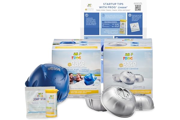 Eliminates organic contaminants 2 ways with a low level of chlorine and FROG Sanitizing Minerals. Minerals last 4 months, SmartChlor lasts up to 4 weeks depending on hot tub size and use; floats when working, flips when empty, ideal for hot tubs up to 600 gallonsYou use up to 75% less chlorine* with FROG @ease, making water easier on skin, hair, swimsuits, and your hot tub’s surfaces. FROG sanitizing minerals eliminates organic contaminants, condition the water for softness and absorb acid to help keep pH balanced3-pack of FROG @ease SmartChlor Cartridge replacements included. SmartChlor is a patented chlorine formula that adds chlorine only when needed for continuous crystal clear water and peace of mind. Say goodbye to constant monitoring and shock treatmentsFROG @ease has its own unique testing method that’s much easier than other test strips, one color match on the FROG @ease Test Strips easily shows when chlorine replacement is neededBundle Includes: FROG @ease Test Strips, FROG Jump Start, FROG Sanitizing Mineral Cartridge, SmartChlor Cartridge, SmartChlor Replacement 3-pack plus FREE Exclusive Hot Tub Care Guide
